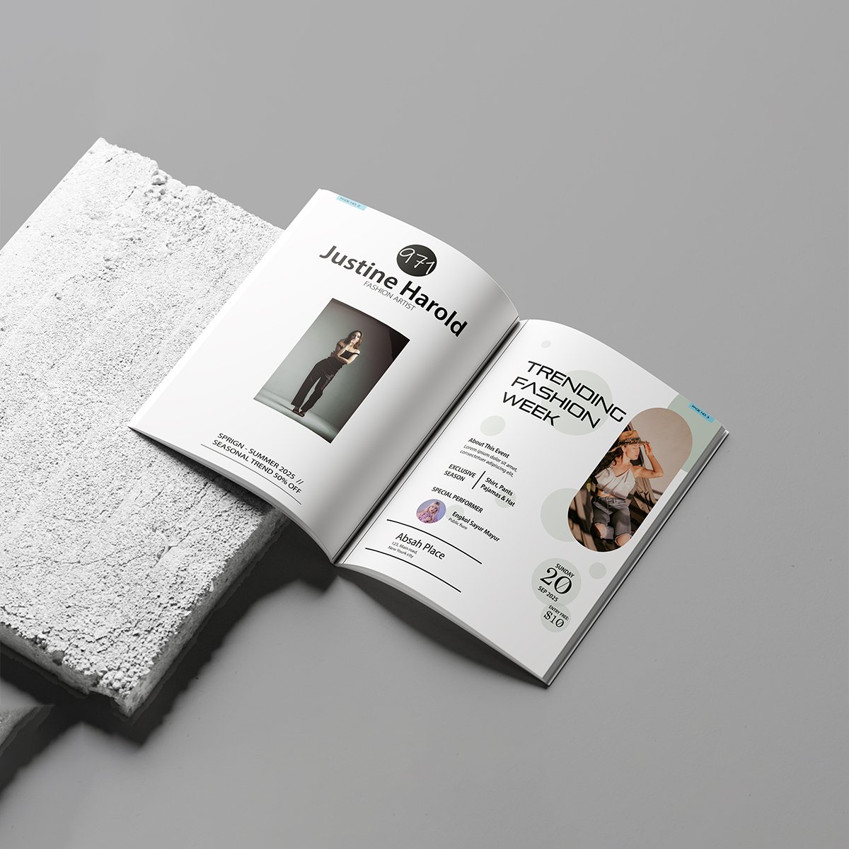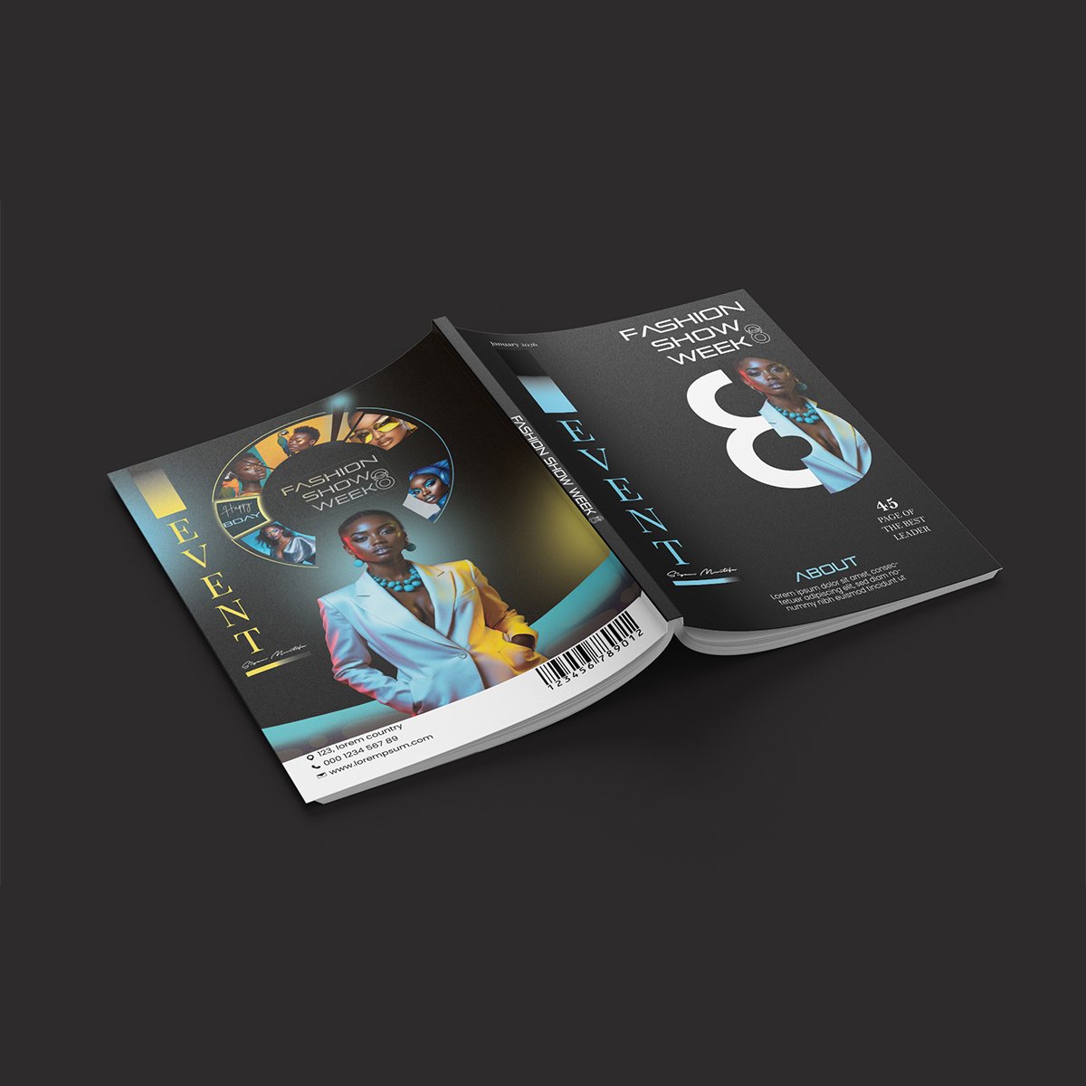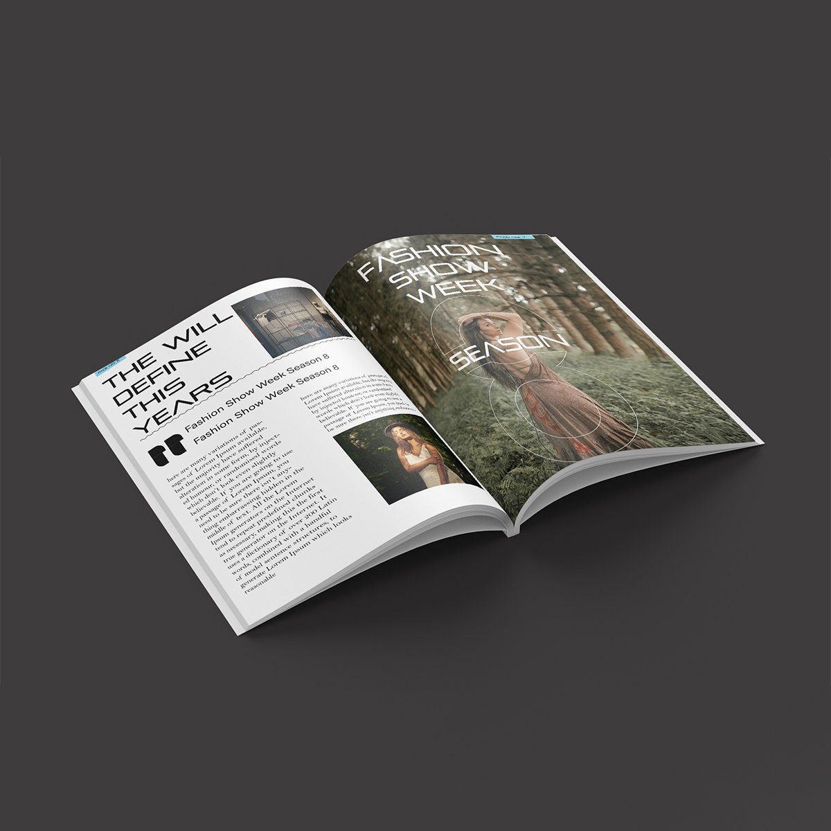 A sleek, high-contrast 3D mockup of a fashion magazine spread featuring “Fashion Show Week.” The design utilizes a sophisticated dark theme, bold typography, and a modern circular photo grid.